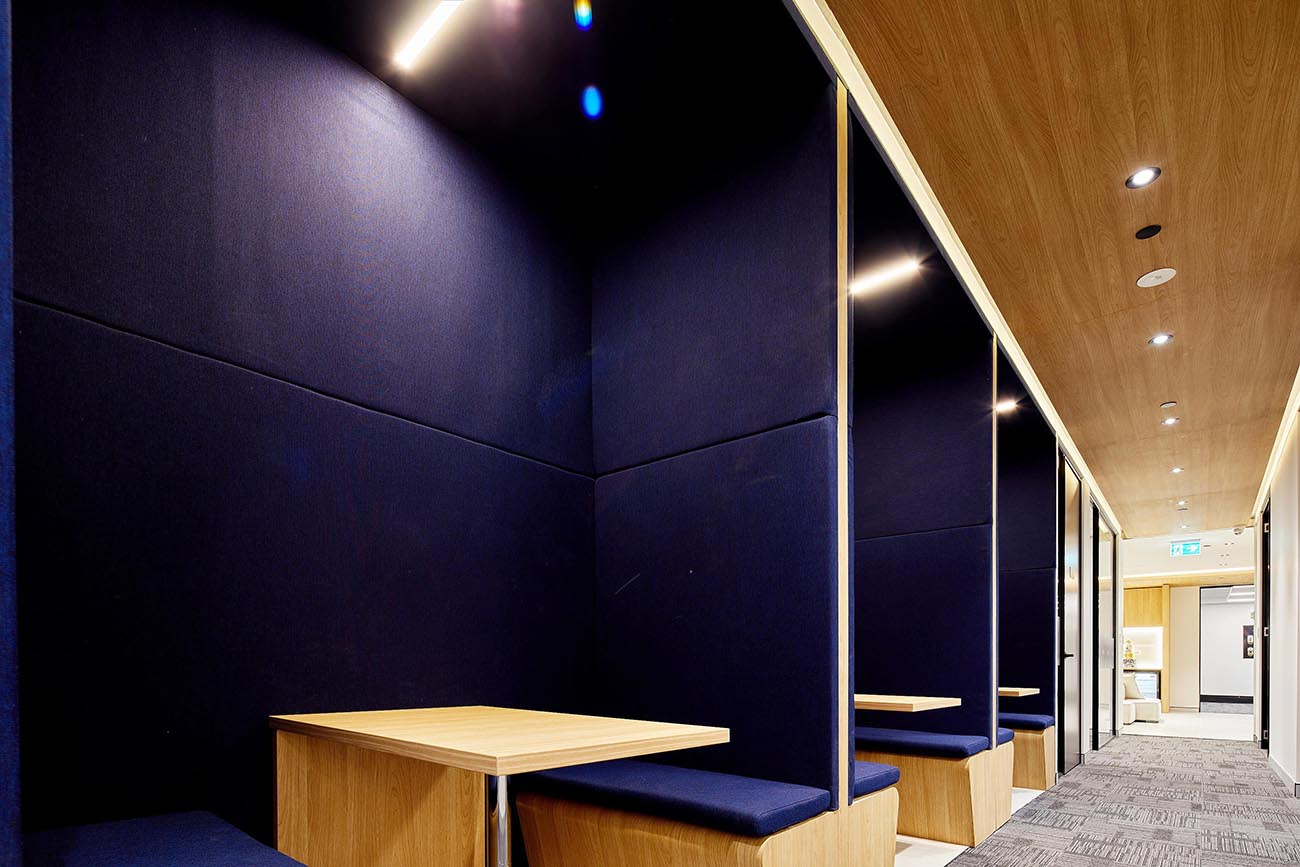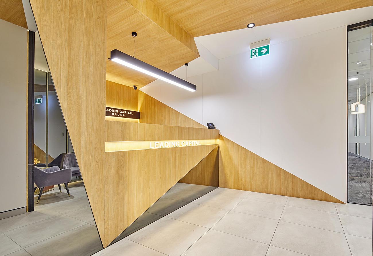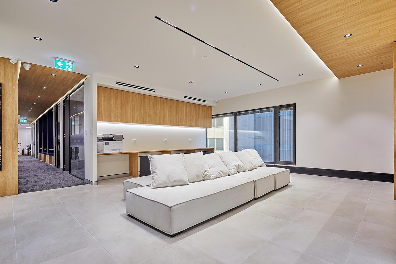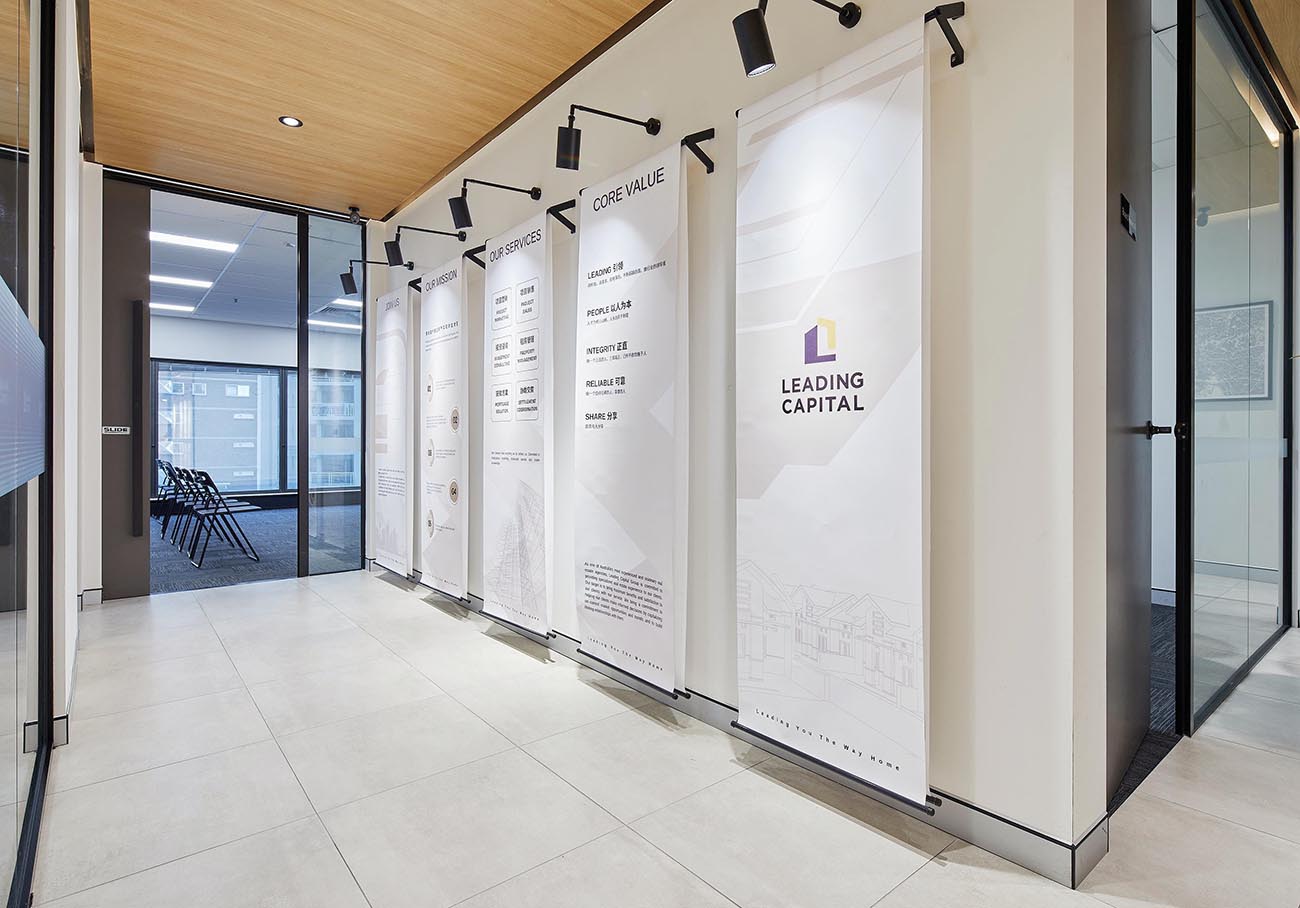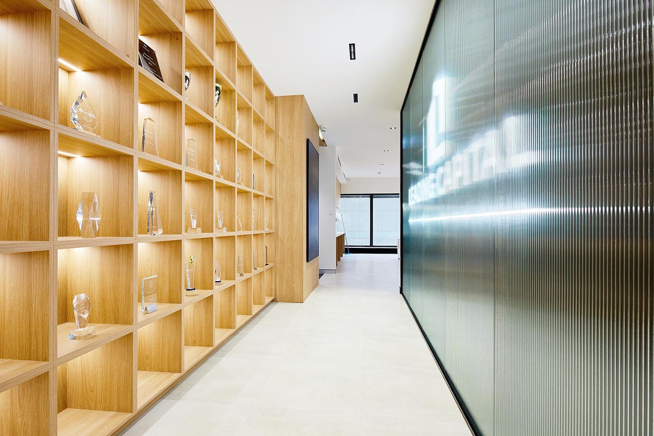 The branding wall is a focal point of the office space. The use of lighting and simple design help to highlight the company’s brand and culture. The display cases showcase the company’s history and accomplishments, providing a sense of pride and accomplishment for employees.