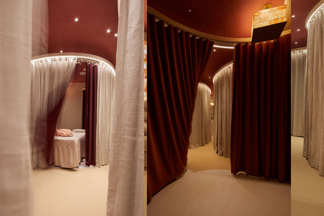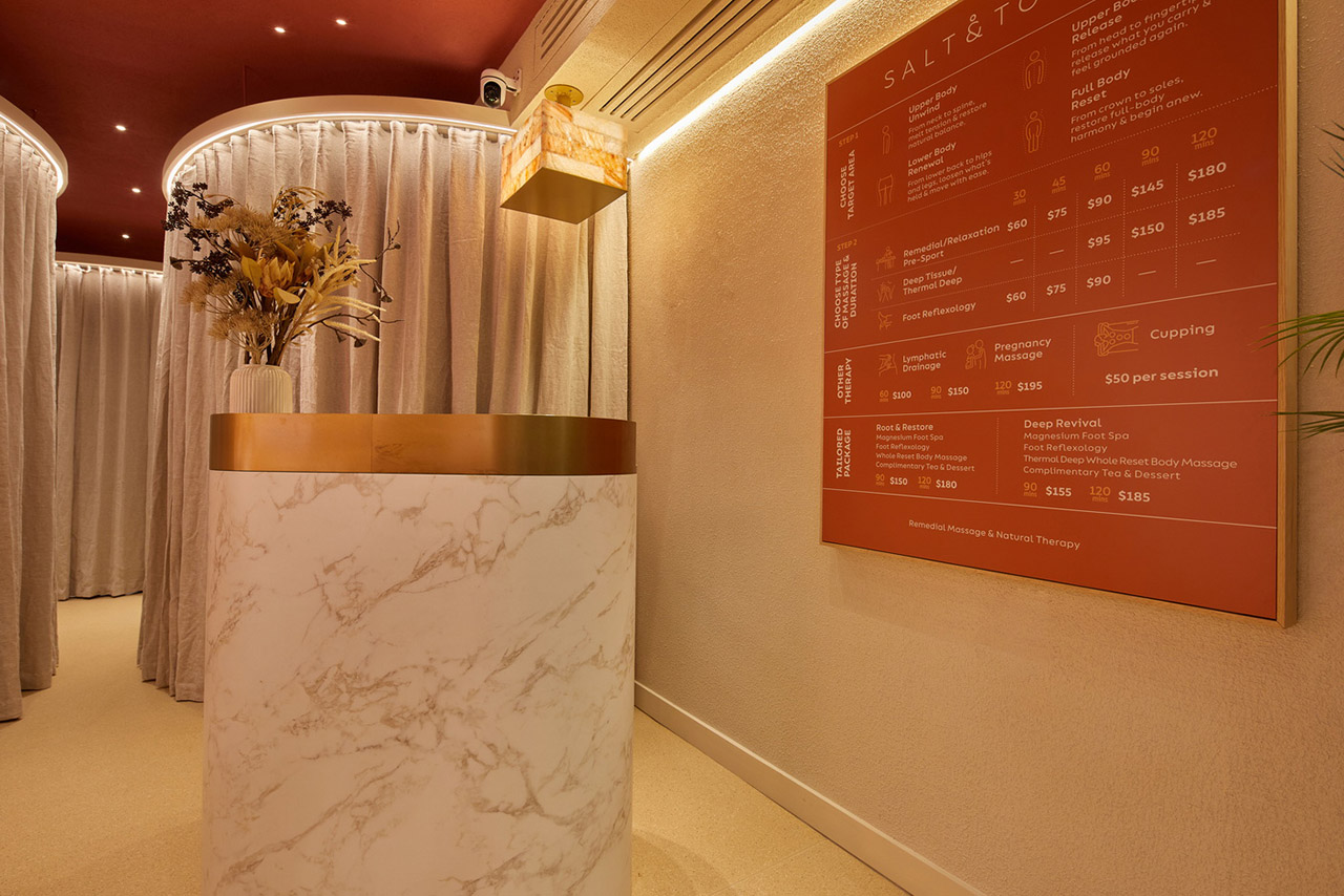 SALT & TOUCH is a chain brand specializing in salt therapy and massage services, dedicated to revitalizing customers’ physical and mental vitality through personalized, immersive therapeutic experiences. This project requires balancing functionality, privacy, and aesthetics within a compact 30-square-meter space, while rationally planning multiple independent functional areas, including a salt therapy area, a massage area, and a waiting area. These areas must be designed to avoid mutual interference, ensuring privacy, comfort, and alignment with the brand’s identity. The design inspiration draws from the natural color randomness and texture of salt bricks, with the overall design anchored in the warm tones and textures of salt bricks. Through a skillful combination of color, materials, and lighting, the design meets diverse functional needs while creating a warm, healing atmosphere, perfectly embodying the brand’s natural and healthy philosophy of “physical and mental vitality.”
