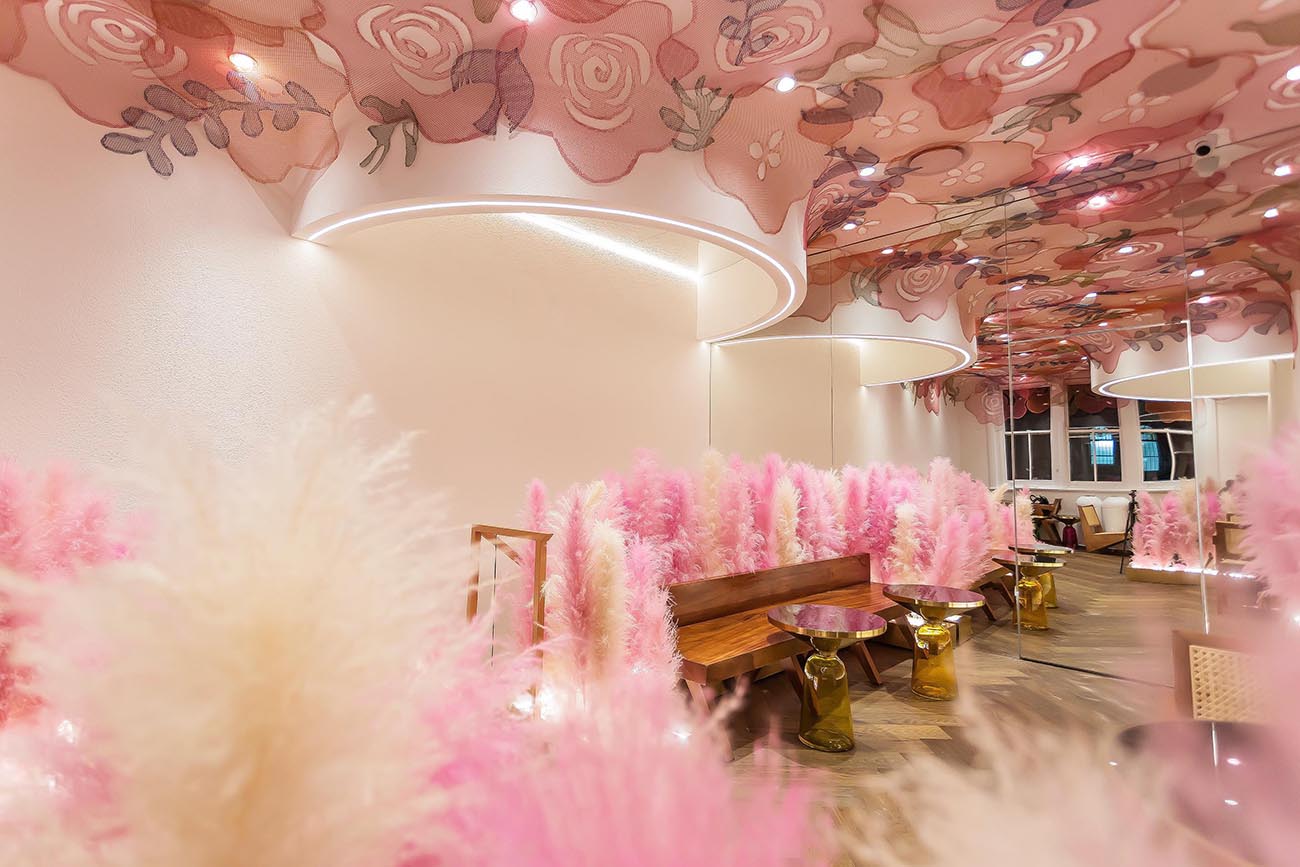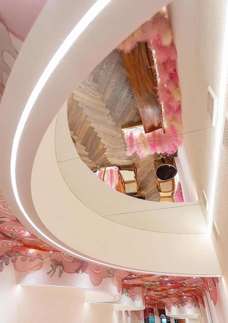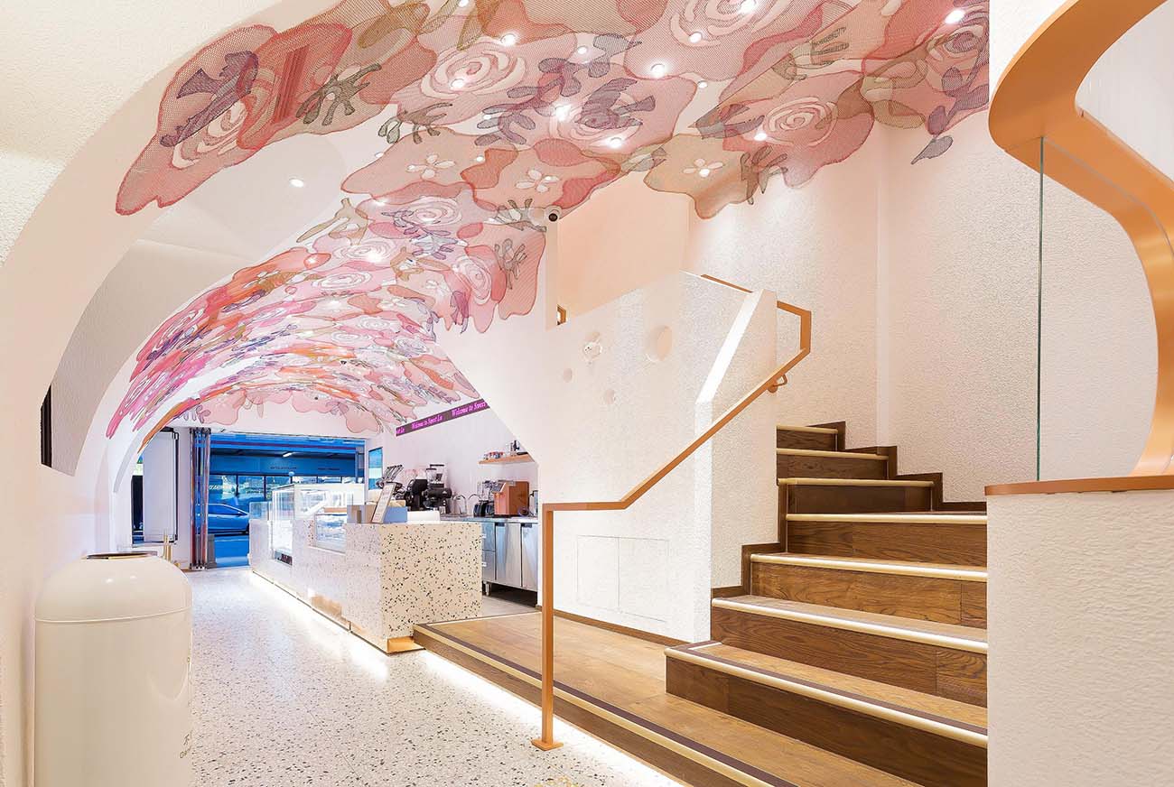 The second floor of the shop is a dining area with more seating. The original wooden floor and chairs are wrapped in pink “feathers,” creating a warm and inviting atmosphere.