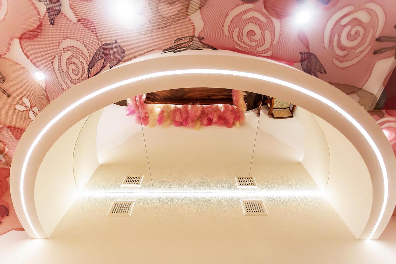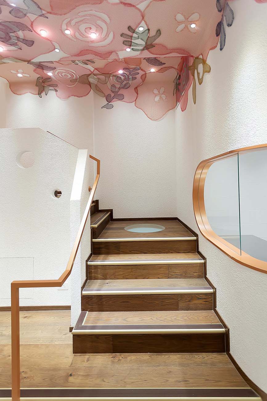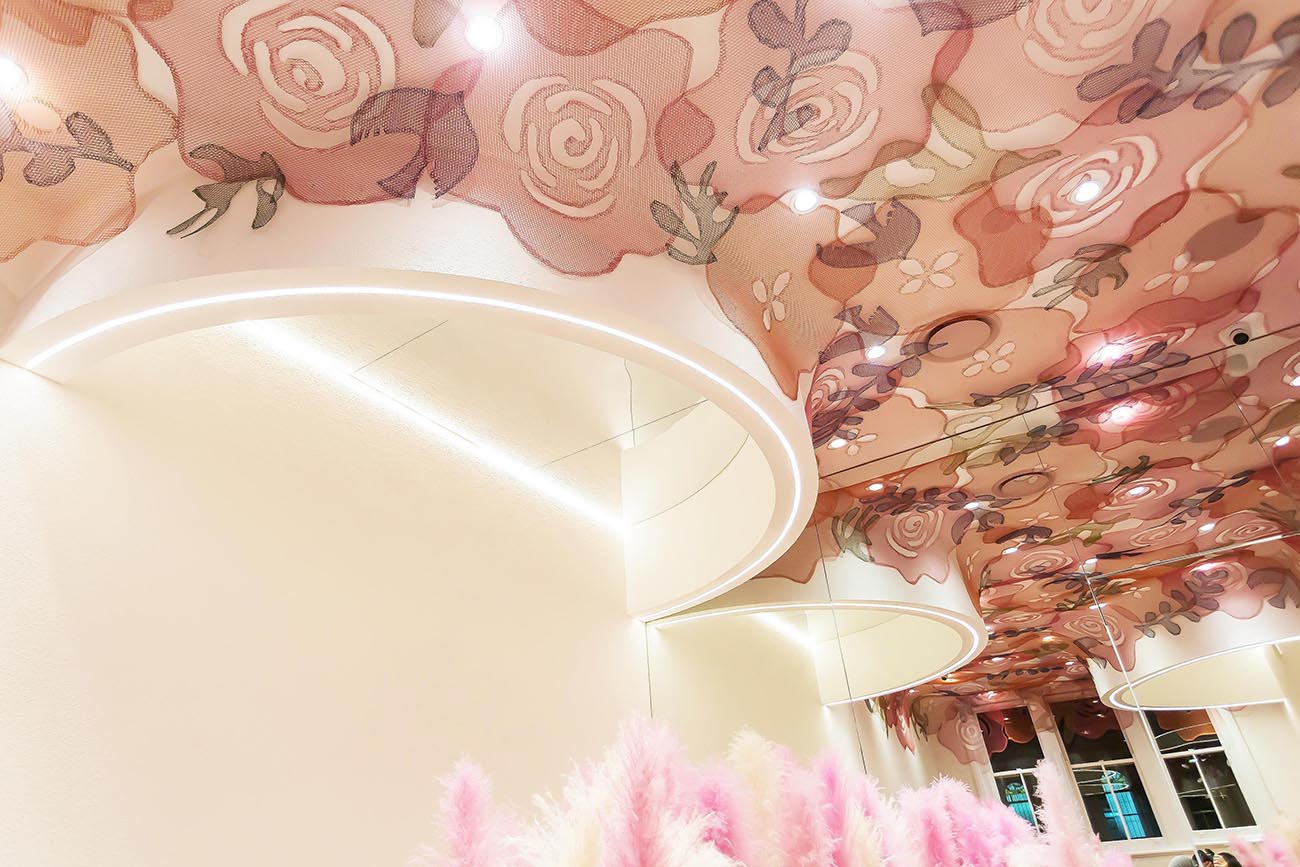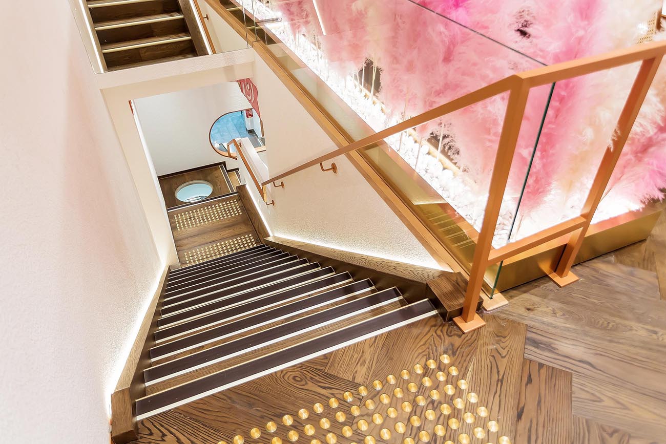The second floor of the shop is a dining area with more seating. The original wooden floor and chairs are wrapped in pink “feathers,” creating a warm and inviting atmosphere.