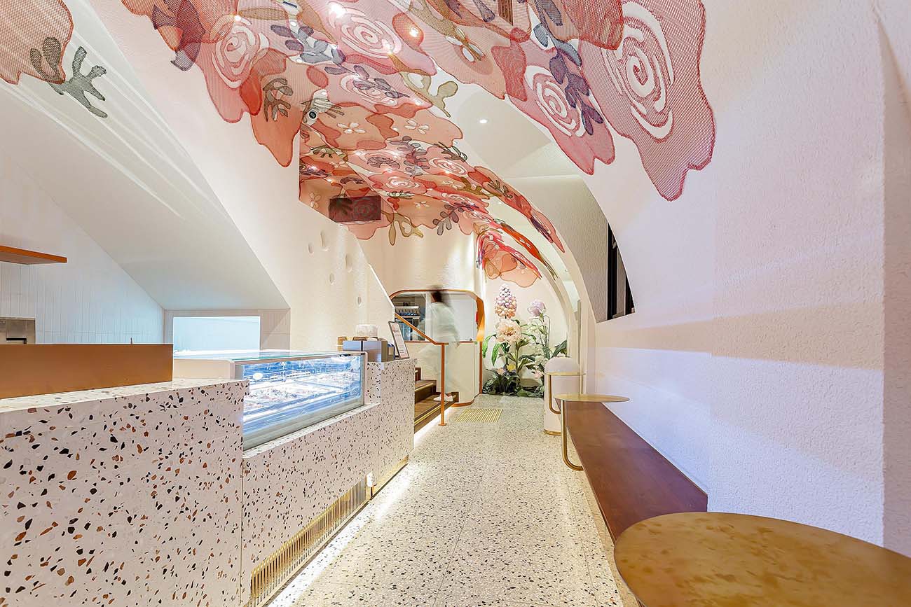 This dessert shop is designed to create a warm and relaxing atmosphere that is full of happiness. The use of soft colors, natural materials, and flowing lines creates a sense of comfort and ease. The transparency of the space also allows natural light to enter, making the space feel bright and cheerful.